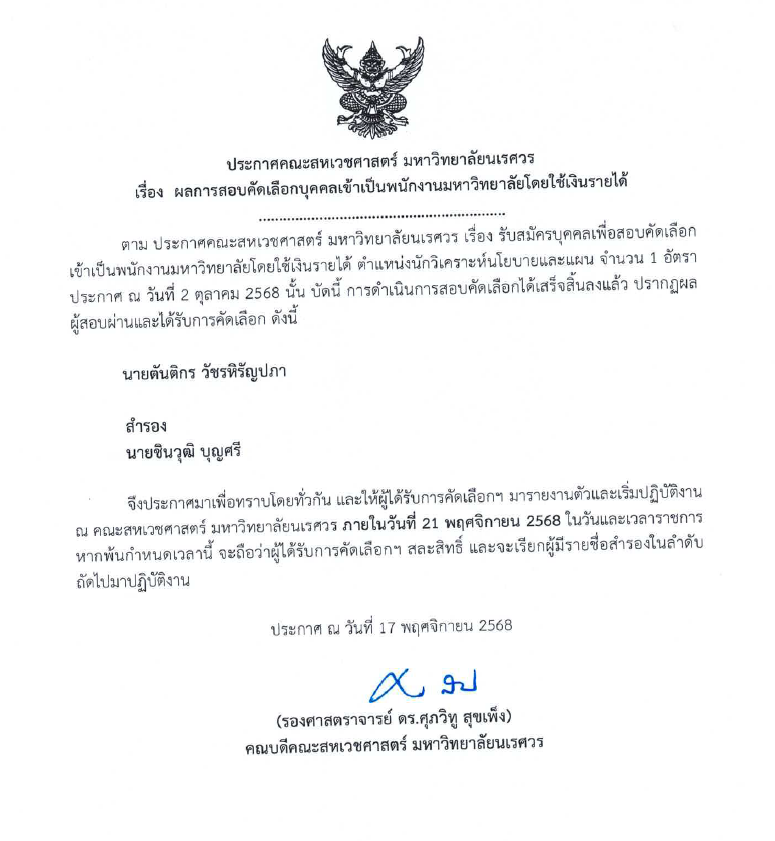 ตาม ประกาศคณะสหเวชศาสตร์ มหาวิทยาลัยนเรศวร เรื่อง รับสมัครบุคคลเพื่อสอบคัดเลือกเข้าเป็นพนักงานมหาวิทยาลัยโดยใช้เงินรายได้ ตำแหน่งนักวิเคราะห์นโยบายและแผน จำนวน 1 อัตรา ประกาศ ณ วันที่ 2 ตุลาคม 2568 นั้น บัดนี้ การดำเนินการสอบคัดเลือกได้เสร็จสิ้นลงแล้ว ปรากฏผล ดังนี้ รายละเอียด ตามสิ่งที่ส่งมาด้วย